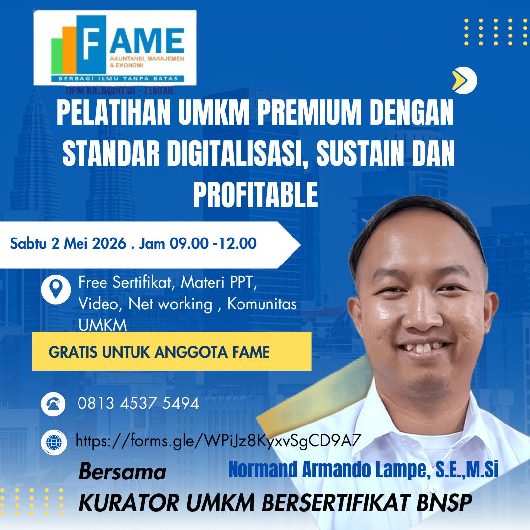 Melalui kegiatan ini, FAME DPW Kalimantan Tengah menghadirkan webinar yang akan membantu pelaku UMKM memahami bagaimana membangun usaha yang premium, sustain, dan profitable.